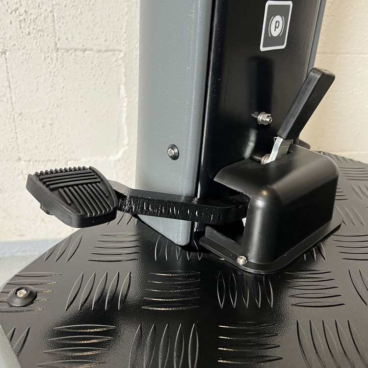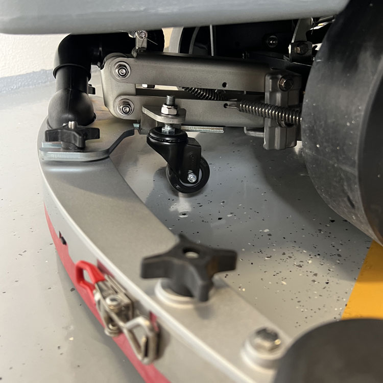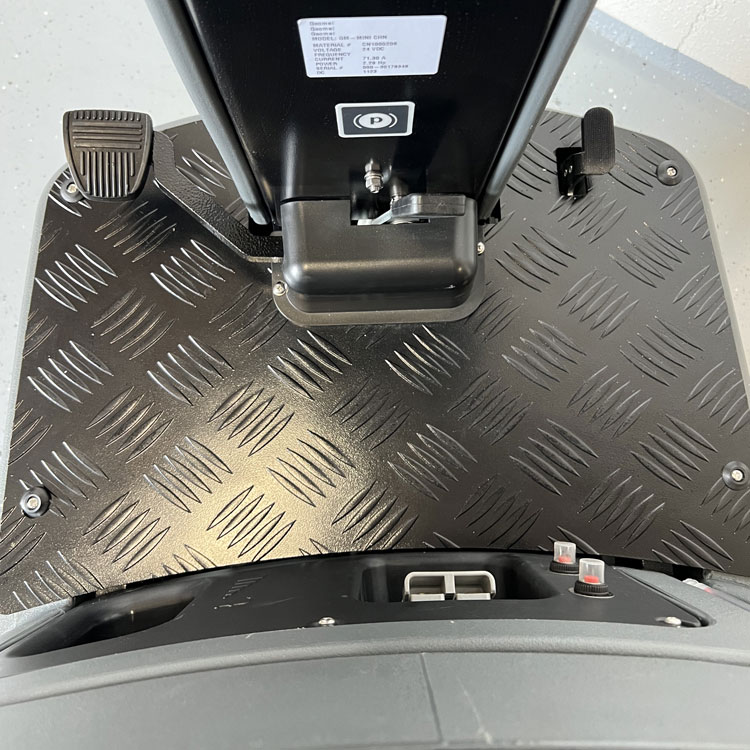 Die GM-MINI verfügt über ein elektrisches Hebe- und Senksystem für die Bürsten und den Saugbalken sowie über ein automatisches System zur Bürstenaufnahme und -abwurf, das dem Bediener die Arbeit erleichtert. Ein besonderes Merkmal dieses Modells ist die mechanische Fußbremse mit Parkmodus.