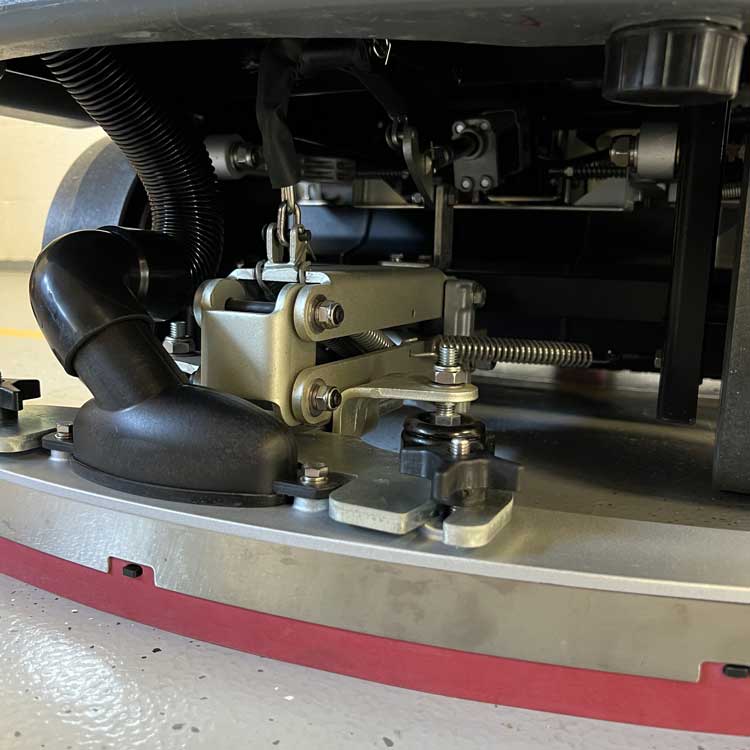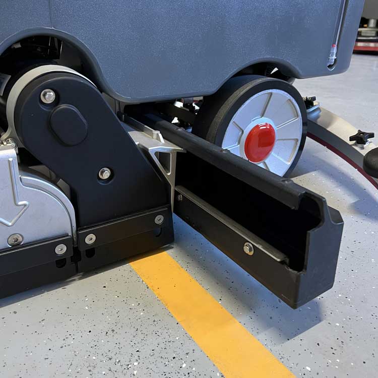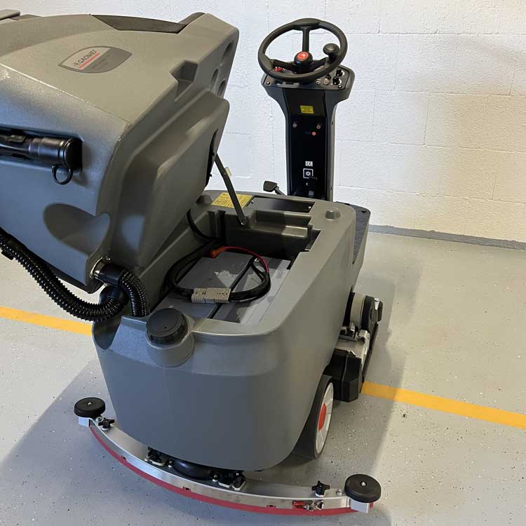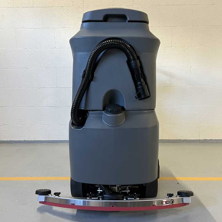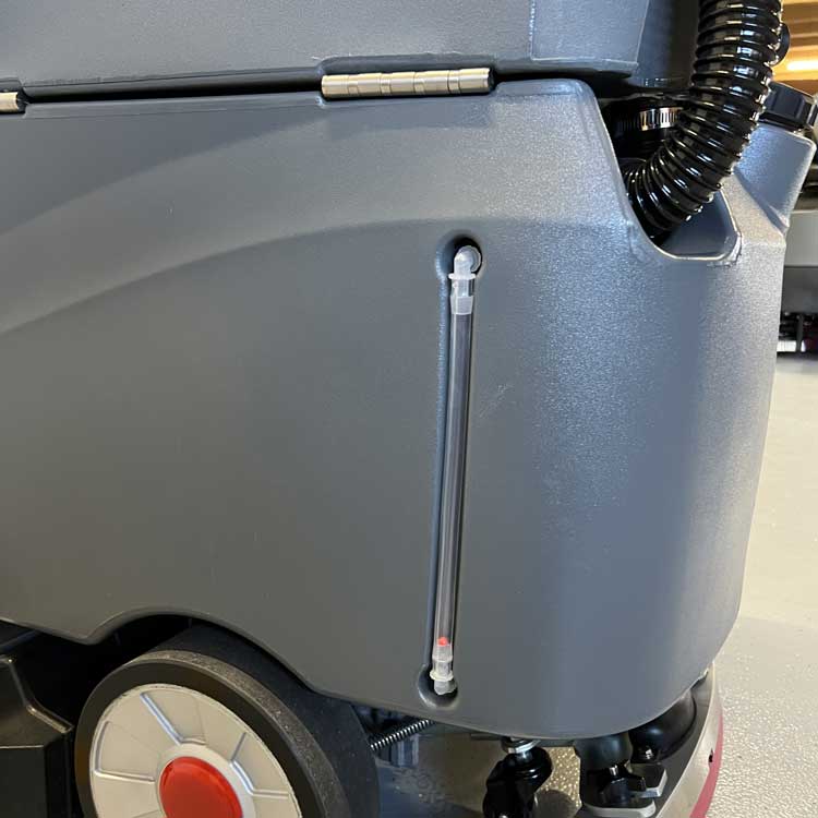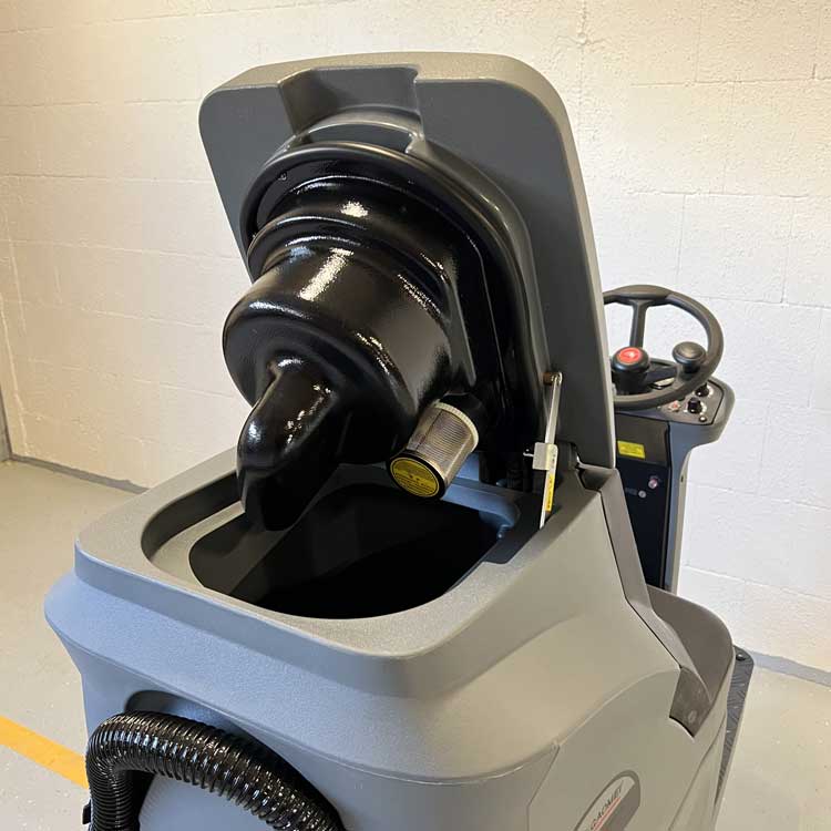 Die Maschine ist mit zwei Tanks für Frisch- und Schmutzwasser von 70 bzw. 75 Litern ausgestattet. Der Schmutzwassertank hat einen Überfüllungsschutz. Am Deckel des Schmutzwassertanks ist eine leistungsstarke Ametek-Saugturbine angebracht. Der Deckel kann außerdem fixiert werden, damit der Tank gelüftet wird. Der Saugbalken ist mit hochwertigen Sauglippen von Linatex (USA) ausgestattet, die das Wasser perfekt vom Boden entfernen.