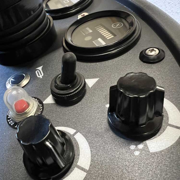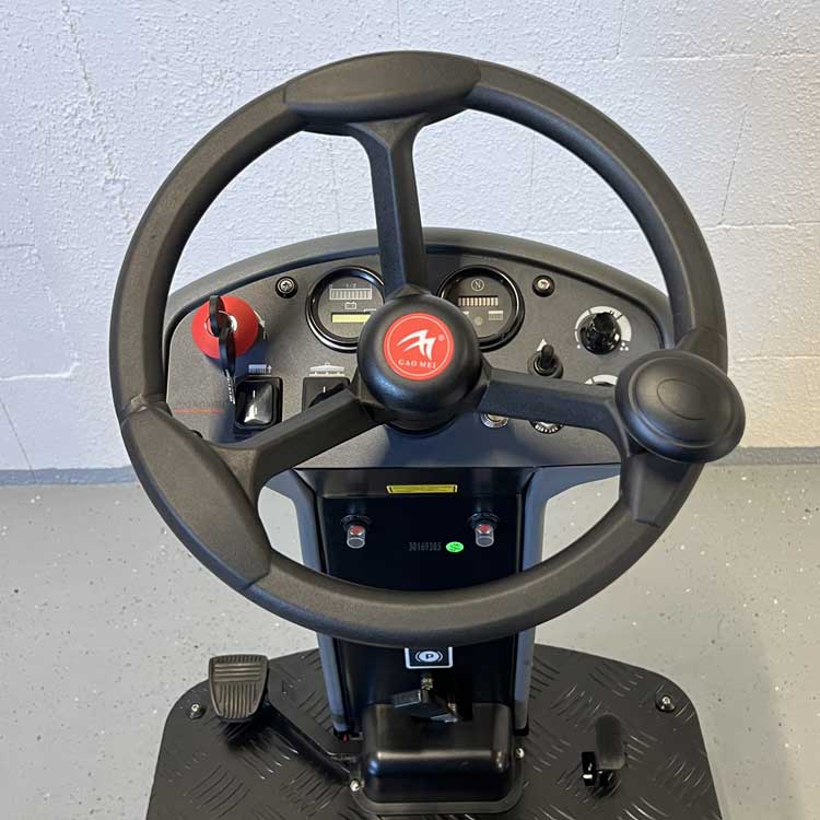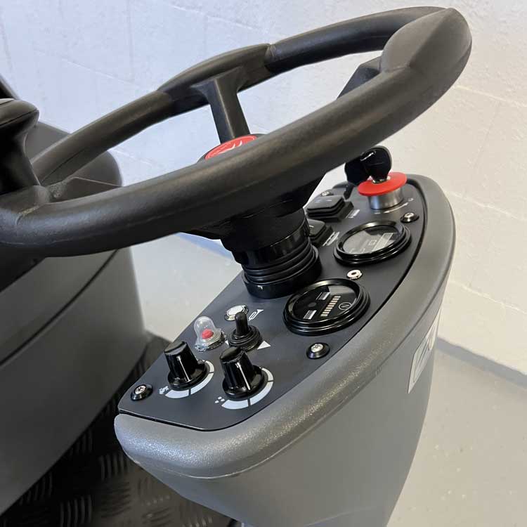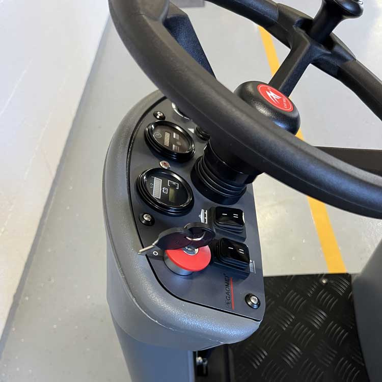 Die Aufsitz-Scheuersaugmaschine GM-RMINI ist mit einer Batterieladeanzeige, einem Betriebsstundenzähler sowie einer Bürstendruckanzeige ausgestattet. Ein- und Ausschalten mit Schlüssel (2 Stück im Lieferumfang enthalten).