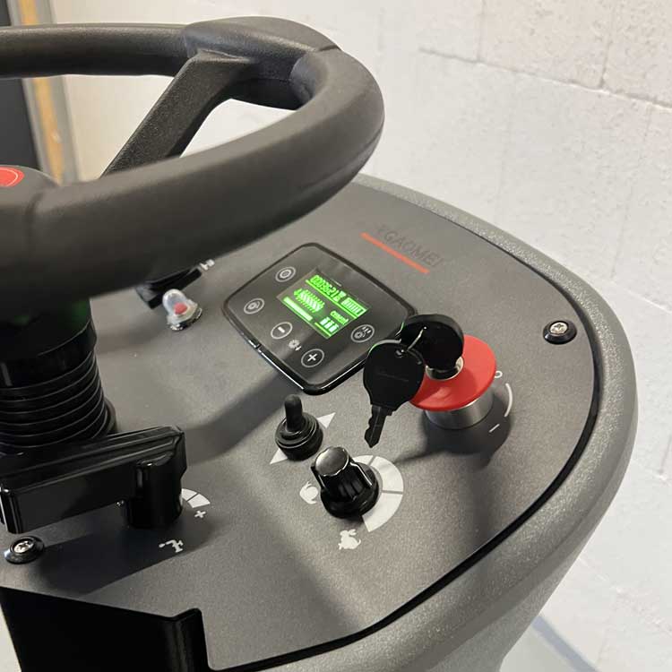 Die Aufsitz-Scheuersaugmaschine GM110BTR80 ist mit einer Batterieladeanzeige, einem Betriebsstundenzähler sowie einer Bürstendruckanzeige ausgestattet. Ein- und Ausschalten mit Schlüssel (2 Stück im Lieferumfang enthalten).