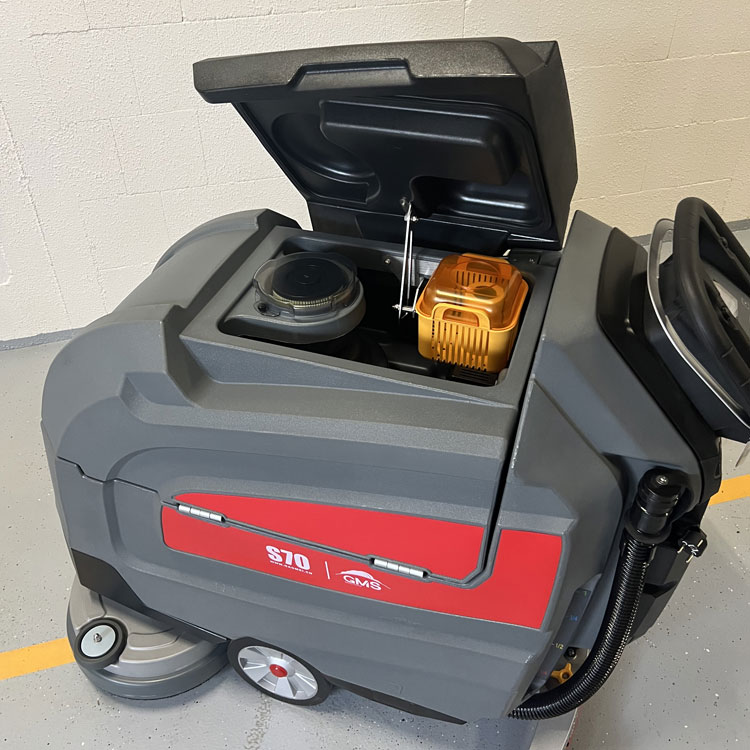 S70 ist ein kabelloses Gerät, d.h. Sie brauchen kein Kabel, das bei der Arbeit immer im Weg ist. Die wartungsfreien und leistungsstarken 120Ah GEL-Batterien der renommierten Firma Chilwee sorgen für einen zuverlässigen Betrieb der Scheuersaugmaschine von mehr als 3 Stunden, ohne dass ein Aufladen erforderlich ist. Dank des innovativen Designs der Scheuersaugmaschine ist der Zugang zu den Batterien und anderen Maschinenteilen einfach und bequem. Die Batterien haben eine Standardladezeit von 6-8 Stunden. Das Ladegerät ist in der Maschine integriert.